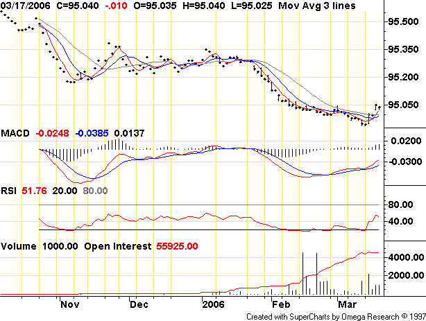 Below is a chart of the Fed funds July 2006 futures contract from TFC charts. You can see the rally this week-